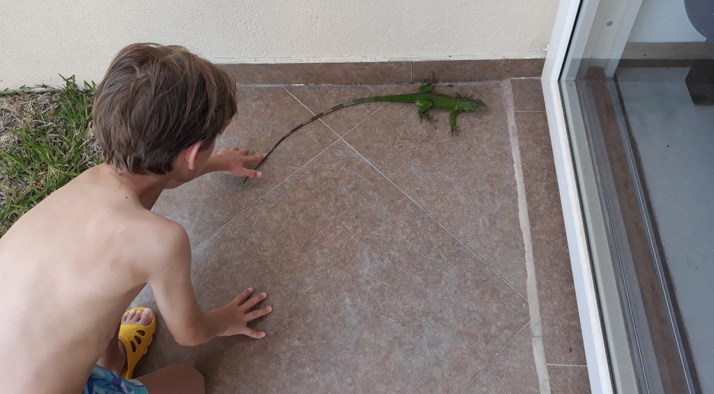 Da wir über Ostern weggefahren waren, brachte der Osterhase natürlich brav etwas in unser Ferienhaus. Es gab einen kleinen zugehörigen Garten und es geschah, dass sich just an Ostermontag ein giftgrüner Leguan in den Garten verirrte. Die Kleine und der Mittlere waren felsenfest davon überzeugt, dass der Osterhase ihnen ein Haustier geschenkt habe und ließen sich nicht davon abbringen, ihn sehr, sehr vorsichtig zu streicheln und ihm Futter hinzustellen. Natürlich waren sie untröstlich als sich der Leguan im Laufe des Tages wieder verabschiedete und sein Futter unangetastet liegen ließ.