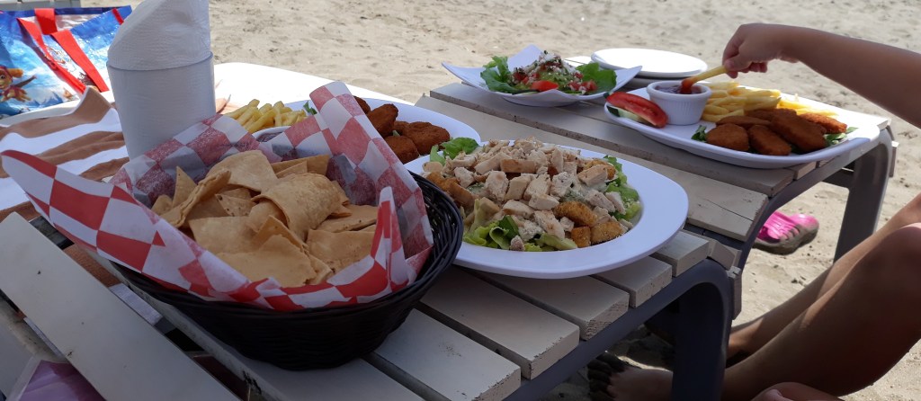 Was mir einerseits auf den Keks ging, auf der anderen Seite aber manchmal ganz angenehm war, war die Menge an Kellnern im Strand-/Poolbereich. Sobald man ankam, wurde einem ein Kellner zugewiesen, der je nach Leute-Aufkommen mehr oder weniger konstant um einen herumscharwenzelte. Immerhin waren die Preise (vergleichsweise) so niedrig, dass wir uns öfters Essen und Trinken bestellten und sogar alle satt wurden, weil die Menge stimmte und es lecker war. Normalerweise kenne ich es so, dass das Essen an Privatstränden a) total überteuert ist und man b) seinen kleinen 15 € Salat ewig auf seinem Teller herumschiebt, weil er nicht schmeckt, er aber so teuer war, dass man ihn trotzdem schon aus Prinzip aufessen muss.