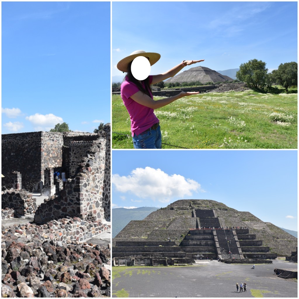 Danach ging es weiter zur Mondpyramide. Die Kinder musste ich mittlerweile mit Weitergeh-Geschichten bei Laune halten, denn was sie bei der anderen Pyramide, die genauso aussah wie die eben bestiegene, auch noch sollten, war ihnen schleierhaft. Ihnen war heiß, die Füße taten weh und sie hatten Durst. Immerhin schafften wir es mit allerlei Späßen zur Pyramide zu kommen und versuchten von dort die Sonnenpyramide „zwischen unsere Hände zu nehmen“. Das das nicht glückte, sieht man ja. Das passiert, wenn man sich auf die Anweisungen und Perspektive der Kinder verlässt. Als ich noch in den palacio de Quetzalpapálotl hinein wollte, streikten die Kinder endgültig und so machten wir uns nach gut 2,5 h wieder auf den Rückweg.