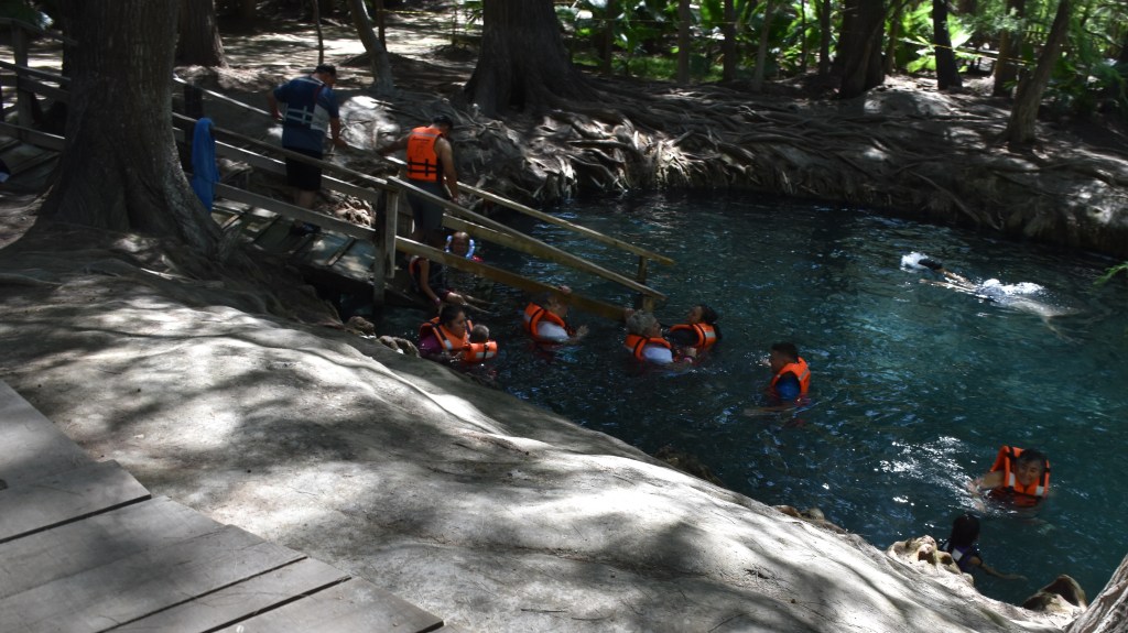 Der Eintritt zur Lagune kostete pro Person 40 Peso (also knapp 2 €). Wir verbrachten insgesamt 5 h dort und hatten uns einen Platz in der Nähe von tiefem Wasser gesucht. Die Zeit verbrachten wir überwiegend im Wasser; schwimmend, tauchend oder auf dem Wasser treibend. Der Mittlere war typischerweise auch unter Wasser mit einem Stock in der Hand anzutreffen und die Kleine war überglücklich, dass der Schwimmreifen für ihre Puppe endlich mal wieder zum Einsatz kam.