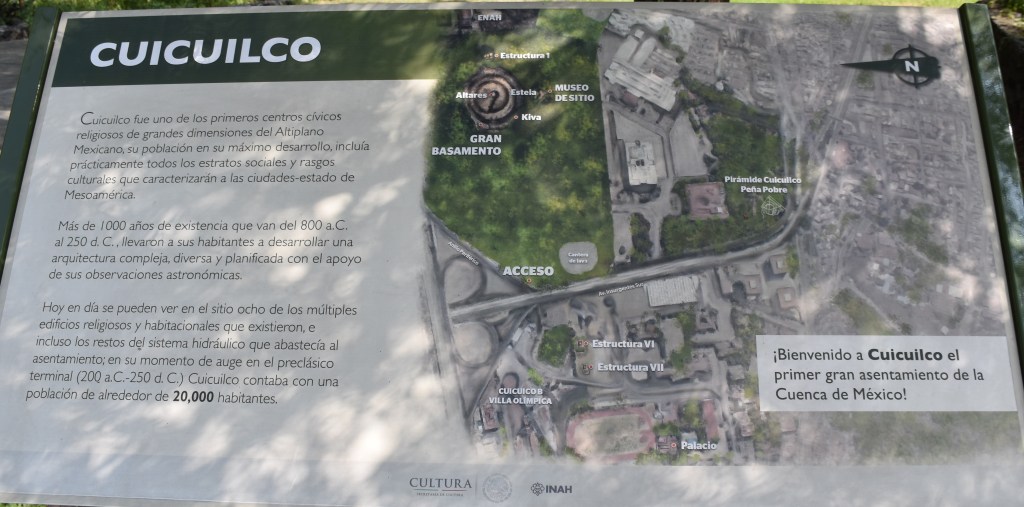 Cuicuilco liegt im Südwesten von Mexiko Stadt und war ab dem mittleren Präklassikum (ca. 600 v. Chr.) einer der wichtigsten Orte Zentralmexikos und somit einer der Hauptkonkurrenten des zu der Zeit noch relativ unbedeutenden Teotihuacán. Als 300 n.Chr. Cuicuilco wegen eines Vulkanausbruchs mit Lava überdeckt wurde, verließen die Bewohner den Ort und zogen vermutlich nach Teotihuacán. Im frühen 20. Jh. fanden die ersten Ausgrabungen statt, bei denen zunächst die große Tempelplattform und später noch weitere Figuren, Plafformen usw. gefunden wurden.