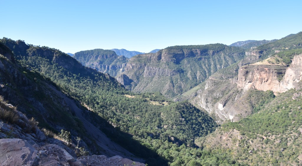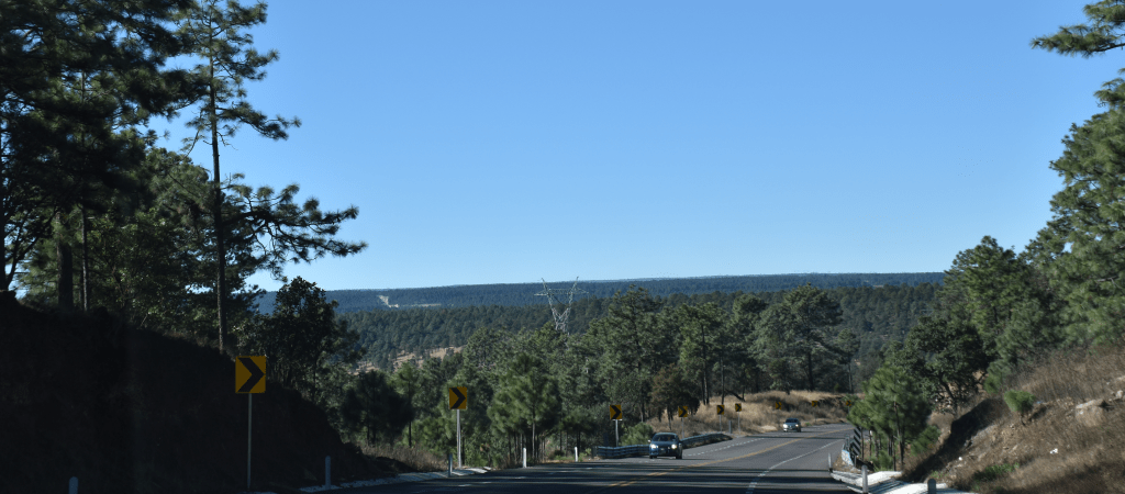 Recht bald hinter Durango fing die Landschaft an sich signifikant zu verändern. Aus der flachen rötlich-braunen Ebene mit kleinem, teils verdorrtem Buschwerk wurde eine sanfte, dicht bewaldete Hügellandschaft.