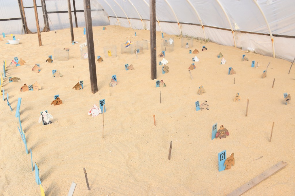 In Todos Santos angekommen, fuhren wir zunächst zu dem Strand mit der Schildkrötenstation (Tortugueros Las Playitas AC), um zu klären, ob eine Anmeldung o.ä. nötig ist. Dies war nicht der Fall, sondern man sollte einfach abends gegen 18 Uhr am Strand erscheinen. Wir nutzten jedoch gleich die Zeit und schauten uns die Brutstätte der Schildkröteneier an. Freiwillige Helfer sammeln am gesamten Strand Eier ein und bringen sie in die Station. Diese besteht vorrangig aus einem großen Zelt ähnlich einem Gewächshaus, in welchem die Schildkröteneier eingegraben und auf deren Schlüpfen gewartet wird. Um die Eier, die bald schlüpfen werden, werden zur Sicherheit kleine Körbe aus Maschendraht gelegt, damit die Babyschildkröten nicht ausbüchsen können. Außerdem haben Besucher die Möglichkeit gegen eine kleine Spende eine Schildkröte zu „adoptieren“ – sie wird natürlich trotzdem ins Meer geschickt – und somit der Organisation zu helfen.