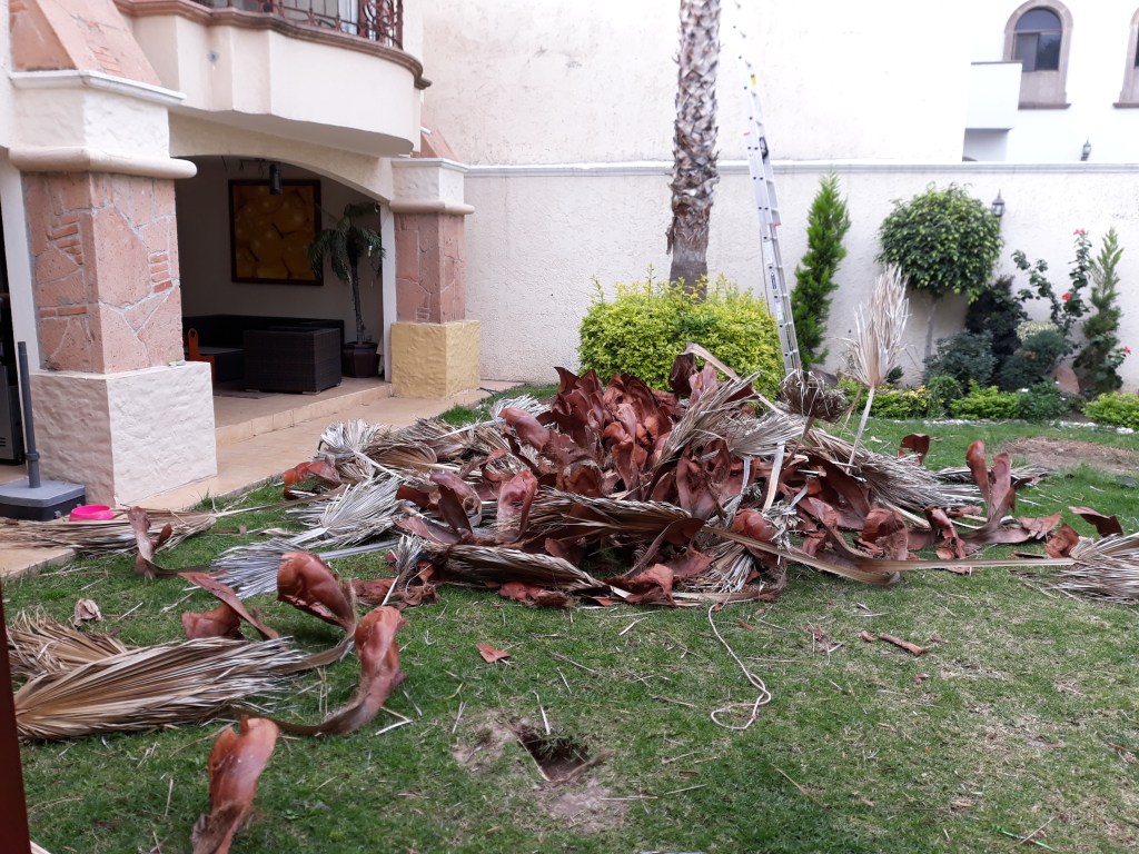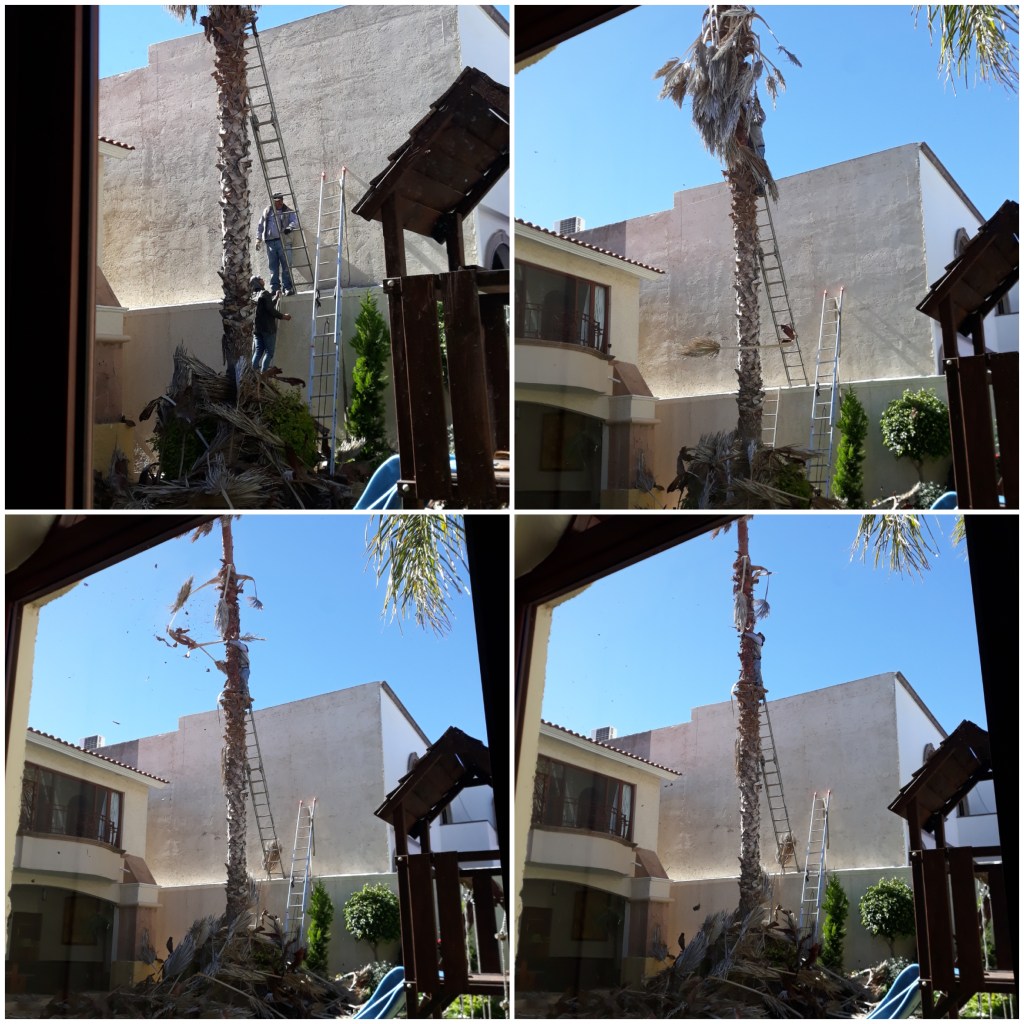 Nichtsdestotrotz begleitete auch das Palmen-Thema uns schon von Anfang an. In unserem Garten haben wir 4 Palmen: drei Kleinere mit ca. 10 m Höhe und eine Große mit ca. 20 m Höhe. Letztere wurde schon seit Jahren nicht mehr beschnitten, weswegen unterhalb der grünen Palmenblätter auf ca. 10 m Länge die braunen verwelkten Blätter hingen. Leider hingen diese relativ lose an der Palme, weswegen bei jedem stärkeren Windstoß die Palmenwedel in den Garten fielen. Das alleine wäre nicht unbedingt ein Problem, weil man diese einfach wegräumen kann. Aber dummerweise sind diese Wedel richtig schwer und kommen karachomäßig vom Baum geflogen. Wir hatten also die ganze Zeit Sorge, dass Laila oder die Kinder getroffen und halb erschlagen werden.
