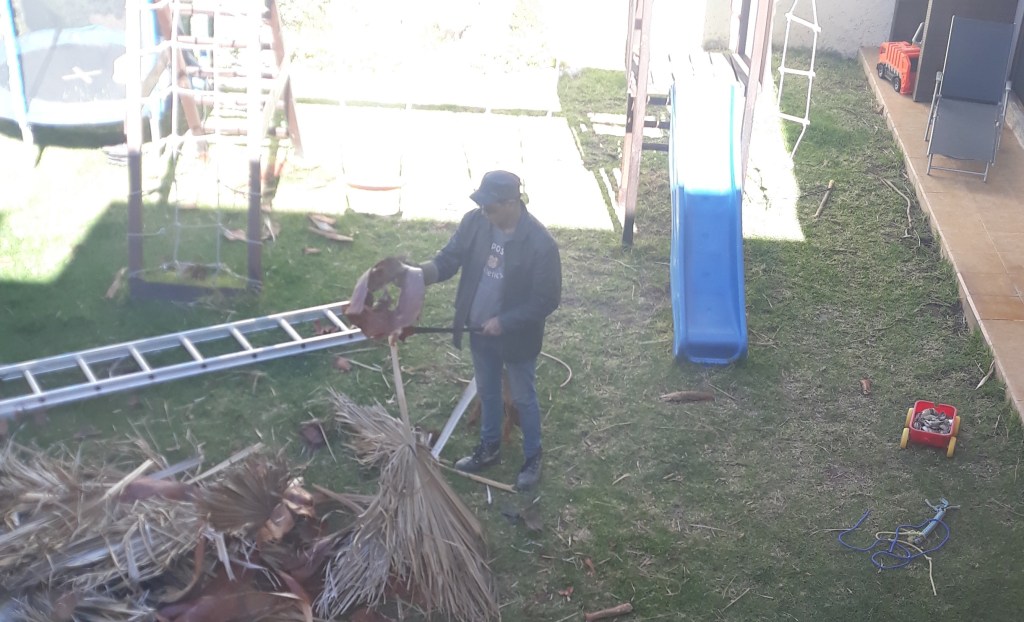 Zunächst einmal beseitigten die beiden den großen Haufen Palmenblätter aus unserem Garten. Um diese in handlichere Stücke zu bekommen, stellte sich Pedro mit der Stichsäge in der einen und dem Palmenwedel in der anderen Hand mitten in den Garten und sägte munter drauf los. Allerdings klappte das nicht besonders gut, da die Säge weder dafür geeignet war in der Luft an irgendetwas herumzusägen noch dachte das stabile Palmenblatt daran, sich durchtrennen zu lassen. Der viel wahrscheinlichere Fall war, dass sich die Stichsäge ihren Weg in seine linke Hand suchte. Das ging Pedro offensichtlich auch auf, denn kurze Zeit später stellte er sein Unterfangen ein und schaute stattdessen seinem Handlanger zu, der mit einer Machete auf ähnliche Art und Weise auf die Palmenwedel einhackte wie zuvor Pedro mit seiner Säge zugange war. Ich hoffte nur inständig, dass er nicht wahlweise seinen Arm oder sein Bein treffen und ich ein großes Blutbad im Garten haben würde.
