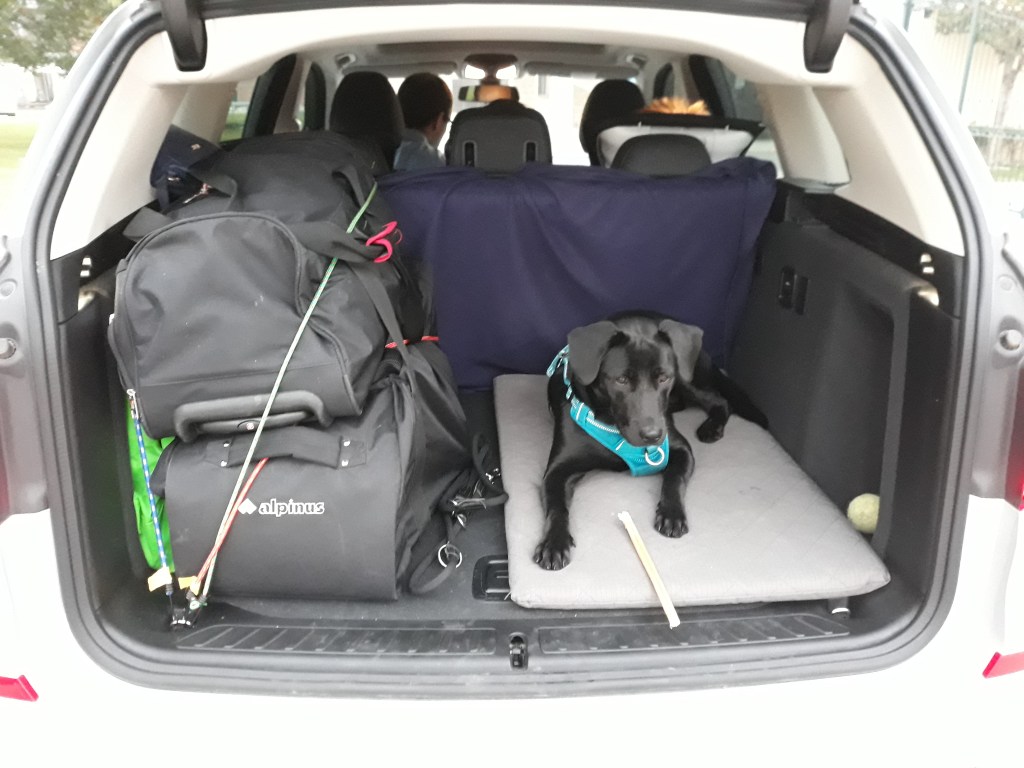 Früher hatten wir einen Käfig für Laila im Kofferraum, aber der ist inzwischen zu klein. Um vorne zwischen meinen Beinen zu sitzen, ist sie mittlerweile auch zu groß, weswegen wir nun erstmalig mit Gepäck und ihr im Kofferraum fuhren und ich muss sagen, dass es echt gut klappte. Sie hatte deutlich mehr Bewegungsfreiheit als vorher und das Gepäck war natürlich gut verzurrt, sodass es nicht auf sie fallen konnte. (Ja, für eine Übernachtung sieht das recht viel aus, aber eine Tasche war komplett mit Fleecedecken gefüllt, weil man nie weiss wie die Temperaturen nachts im Hotel so sind.)