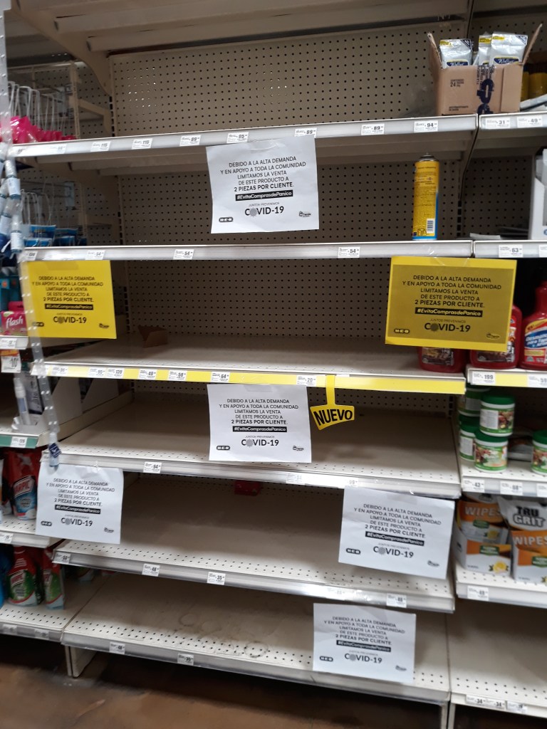 Außerdem gab es Beschränkungen wie viel jeder Haushalt kaufen darf, wie z.B. 4 Gemüsedosen, 1 Packung Eier, 1 Packung Mehl usw. Viele der billigen Lebensmittel waren schon ausverkauft, doch während wir „einfach“ zum etwas teureren Markenprodukt greifen können, ist dies vielen Mexikanern nicht vergönnt. Während seines Einkaufs hörte mein Mann immer wieder links und rechts „Das ist zu teuer.“, „Das können wir uns nicht leisten.“ und an der Kasse gingen dann Diskussionen über mögliche Ratenzahlungen für einen Einkauf in Höhe von 40-50 € los.