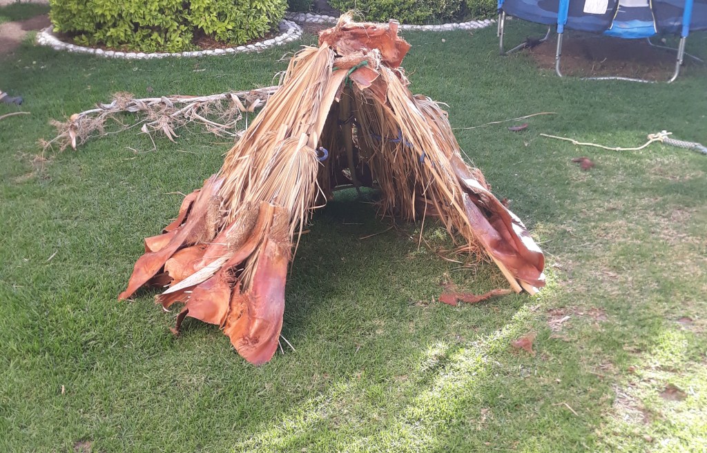 Gegen den Lagerkoller – ich glaube meinem Mann fällt es von uns allen am schwersten eingesperrt zu sein – hat mein Mann mit spärlicher Hilfe der Kinder aus heruntergefallenen Palmenblättern ein Tipi gebaut. Endlich sind die mal zu etwas nütze.