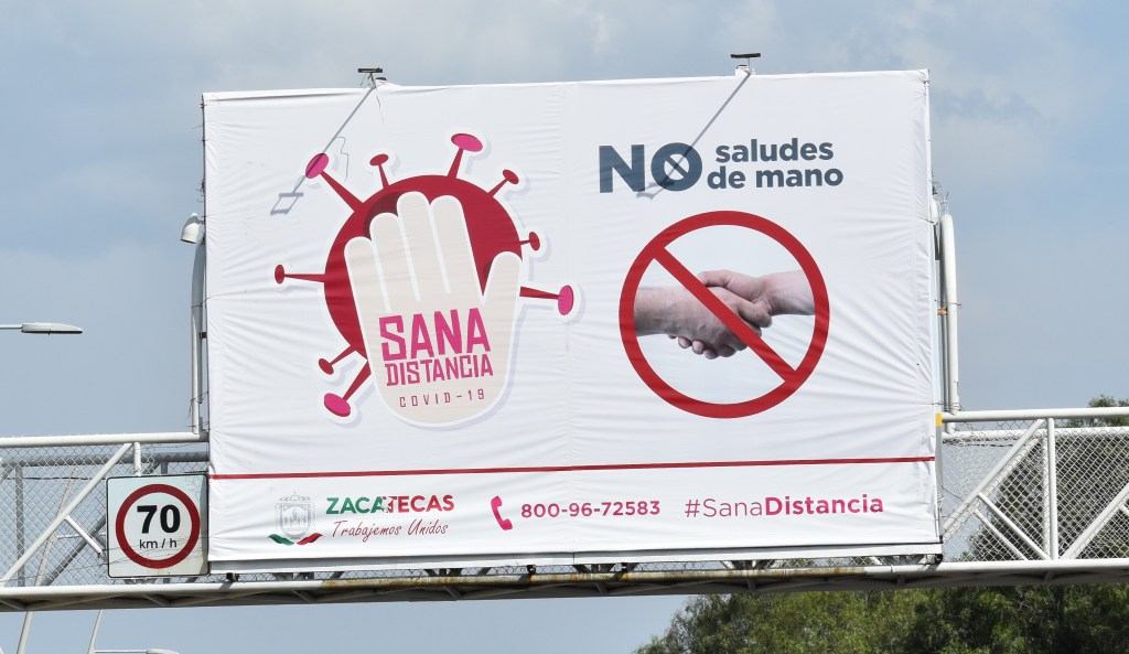 Sa, 21.03.20 – In Zacatecas haben wir viele Schilder gesehen, die zur gesunden Distanz aufrufen und das Händeschütteln verbieten. Eigentlich eine gute Sache, wenn sich die Mexikaner zur Begrüßung nicht umarmen würden. Das ist hier deutlich üblicher als die Hand zu geben und wird nach wie vor nicht unterlassen. Wir sehen sogar öfters wie sich die Leute zum Umarmen extra noch die Maske vom Gesicht wegnehmen, um auch das obligatorische Küsschen auf die Wange geben zu können.