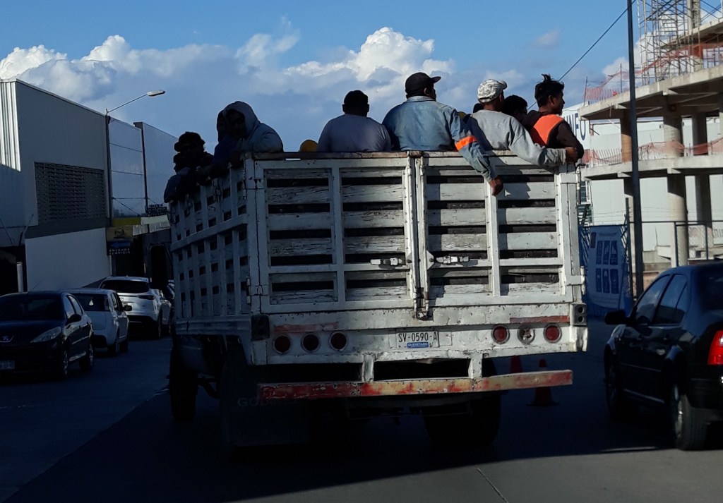 - … 20 Bauarbeiter gemeinsam mit Schubkarre, Betonmischer, Fahrrad und sonstigen Baumaterialien zusammengepfercht stehend auf der Ladefläche eines altersschwachen Pickups zur Baustelle fahren.
