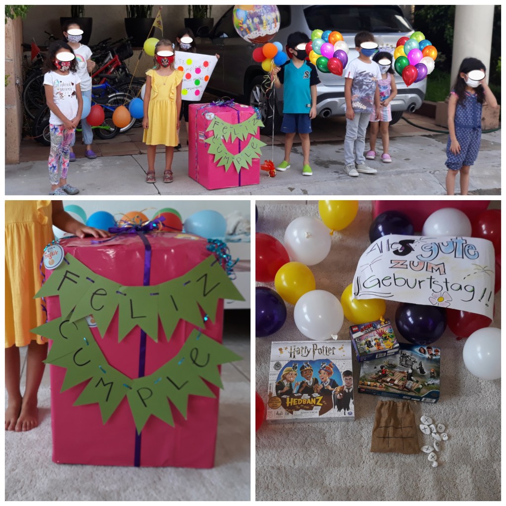 Nach einem gemeinsamen Foto der Kinder – natürlich mit Abstand und Mundschutz – und dem Geschenk fuhr die Karawane noch zweimal an unserem Haus vorbei bis sie sich wieder verabschiedete. In ihrem Zimmer packte sie natürlich sofort das Paket aus und zum Vorschein kamen 2 Lego-Sets, ein Harry-Potter-Spiel, ein selbstgebasteltes Tic Tac Toe und viele viele Luftballons.