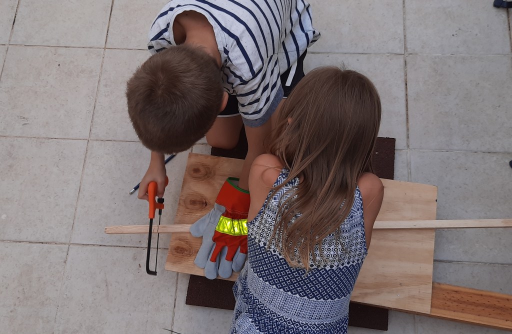Die zweite Erkenntnis war: Es fehlt vor allem an Papas Muskelkraft, denn gleichzeitig sägen und Holz festhalten ist zu schwer. Deswegen wurde die kleine Schwester zum Mitfesthalten herbeordert.