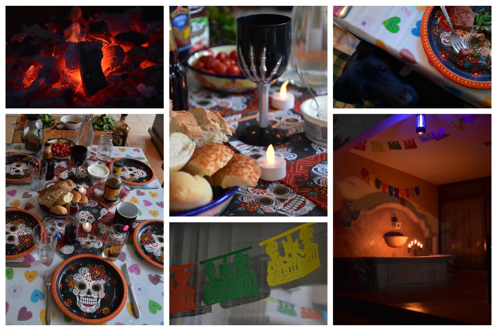 Nach getaner Arbeit hielten die Kinder und ich das Stockbrot (teilweise zu tief) ins Feuer, während Laila und mein Mann unser restliches Abendessen auf dem anderen Grill bewachten. Da kurz nach Halloween in Mexiko der día de los muertos gefeiert wird, schmückten wir unsere Terrasse mit den typischen bunten Totenkopfsymbolen.