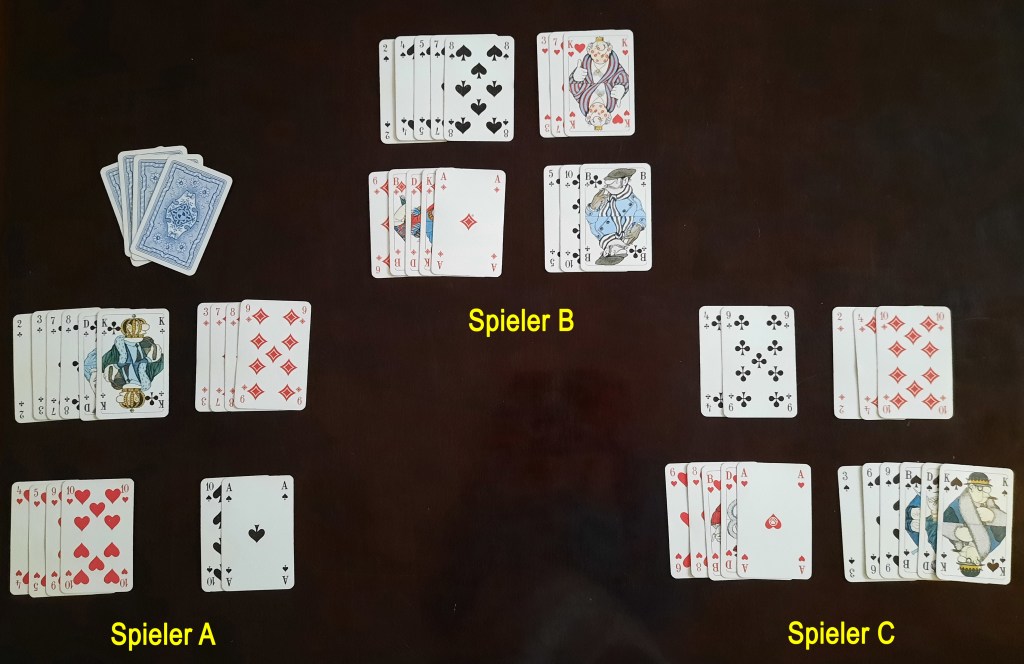 Spieler A deklariert Kreuz als Trumpf und nimmt sich danach den extra Stapel mit den 4 weiteren Karten.