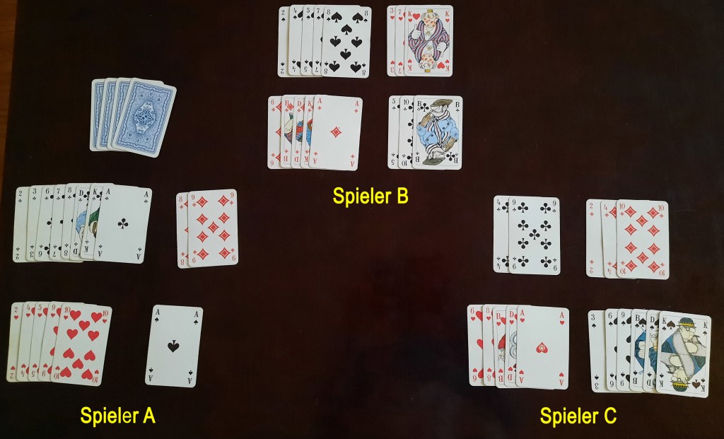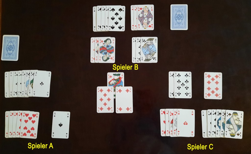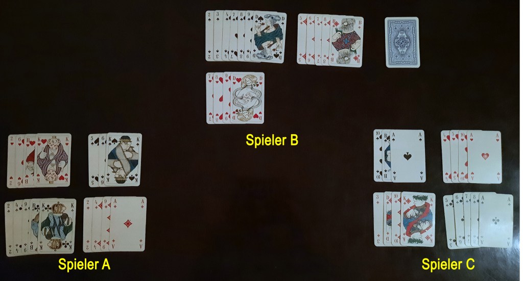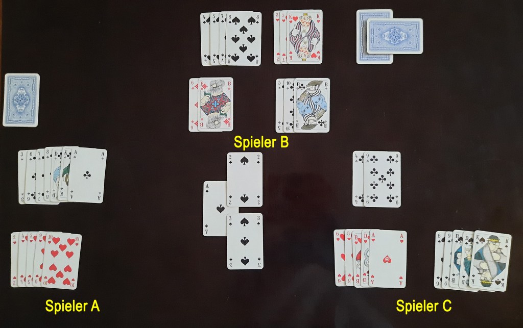 Spieler B sortiert diese in seine Handkarten ein und stellt dabei fest, dass die höchste Karte von dieser Farbe ein Ass ist. Dieses muss er Spieler C im Tausch für die Pik 9 geben.