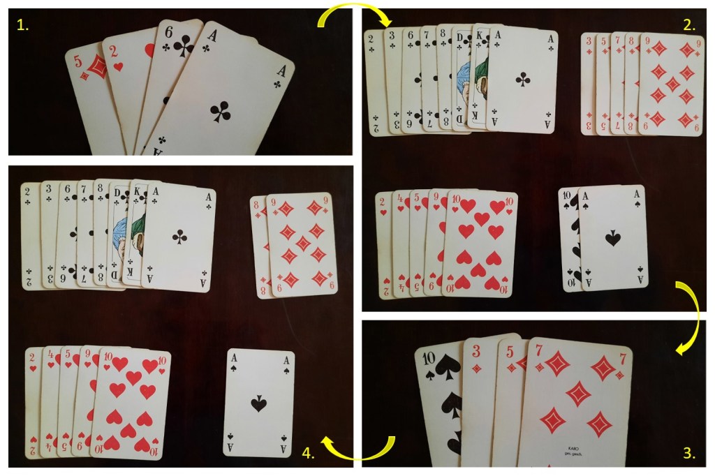 Spieler A hat Glück und erhält zwei weitere Kreuzkarten sowie eine Herz- und eine Karokarte (siehe Schritt 1). Er sortiert die 4 neuen Karten in seine bisherigen Karten ein (siehe Schritt 2). Die nicht benötigten Karten – 3 Karo- und eine Pikkarte – legt er verdeckt zurück (siehe Schritt 3) und hat nun wieder 16 Handkarten (siehe Schritt 4).