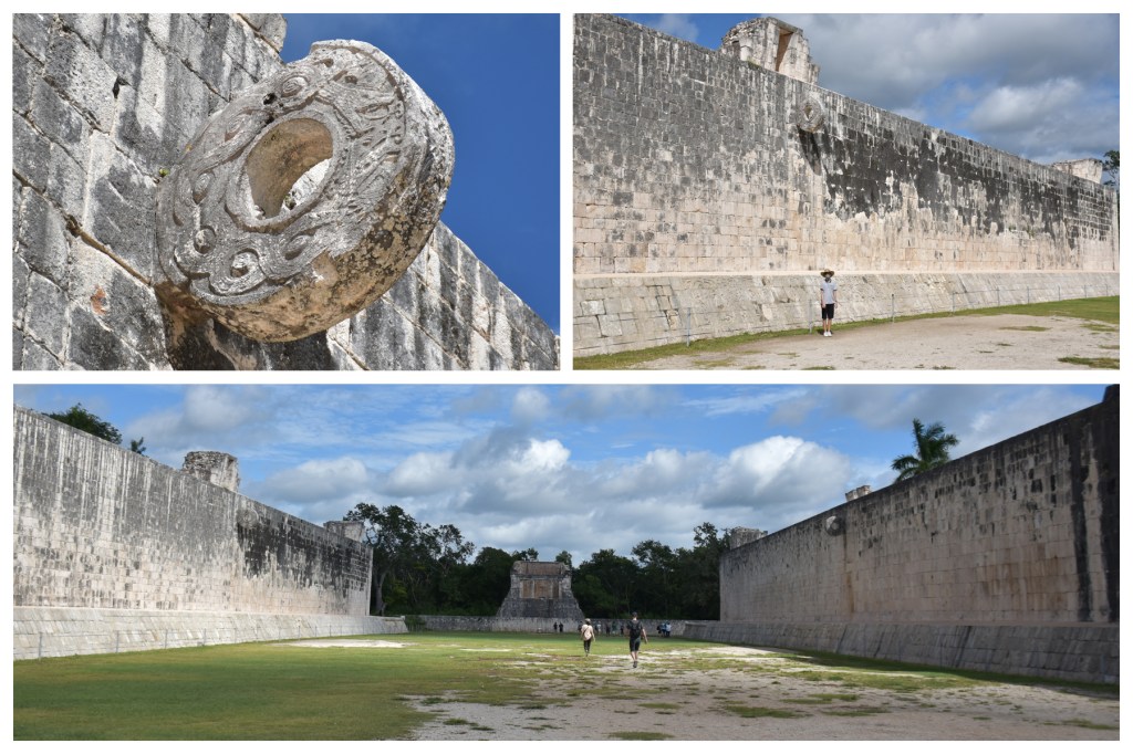 Vor allem den Sportplatz fand ich sehr faszinierend. Das Ballspiel, welches zur damaligen Zeit von so ziemlich allen in Mexiko lebenden Kulturen mit jeweils kleinen Variationen gespielt wurde, war in der Maya-Kultur ein blutiges Sportereignis. Es gab zwei Mannschaften, die versuchten einen kleinen Ball durch Ringe zu befördern, wobei sie allerdings weder Hände noch Füße, dafür aber den Rest des Körpers benutzen durften. Die Höhe und Lage der Ringe war jedoch in jeder Mayaanlage unterschiedlich. In Chichén Itzá hingen die Ringe ca. 5-6 m an einer horizontalen Wand und es ist mir schleierhaft wie man den Ball ohne den Einsatz von Händen und Füßen in dieser Höhe durch einen verhältnismäßig kleinen Ring befördern soll.