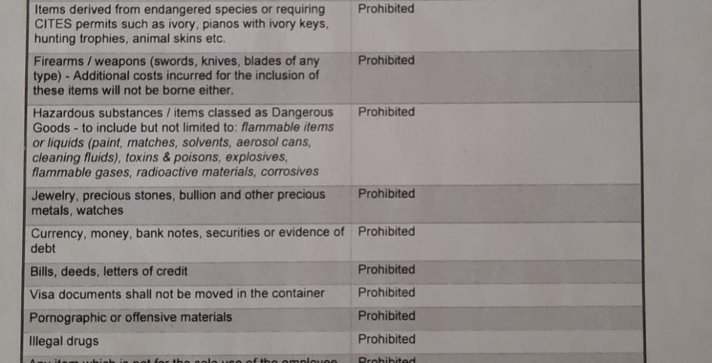 Auch dieses Mal bekamen wir solch eine Liste, die wir wieder abarbeiten durften. Zu den bekannten Dingen kamen Schmuck und wichtige Dokumente, wie Urkunden, Zeugnisse, Kredite, Rechnungen, zu den verbotenen Dingen hinzu. Bei unserem letzten Umzug hatten wir als Ausweichmöglichkeit die Luftfracht und 10 Koffer während unseres Hinfluges. Bei unserem jetzigen Umzug entfällt allerdings sowohl die Luftfracht als auch die 10 Koffer, da wir die Grenze mit dem Auto überqueren werden. Dementsprechend mussten wir alle verbotenen Sachen aussortieren und einen Großteil zu unserem Look&See im letzten Mai mitnehmen.