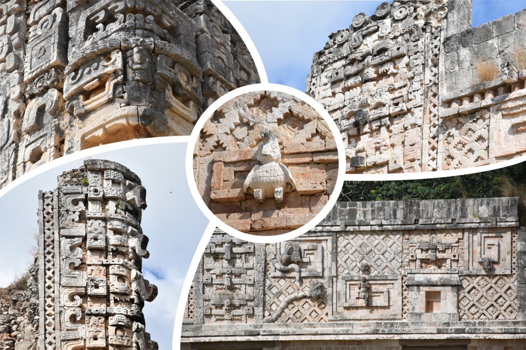 Danach ging es vorbei am Haus der Nonnen, dem üblichen Ballspielplatz, dem mittlerweile die Tribünen fehlen, weiteren Tempeln und Häusern bis hin zum riesigen Gouverneurspalast, die allesamt nicht nur mit ihren gut erhalten Bauten beeindruckten, sondern auch mit Unmengen an großen Terrassen, Säulen, Torbögen und verzierten Fassaden. Letztere sind überwiegend im klassischen Puuc-Stil gehalten, was typisch für die Region ist.