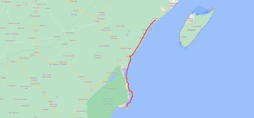 Anmerkung: Wir waren im November 2020 dort und seitdem hat sich der Zustand der Straße massiv verschlechtert. Die Schlaglöcher sind mittlerweile teils knietief und es ist nicht ratsam mit eigenem PKW dort entlang zu fahren (Stand Februar 2022). Wenn doch, dann nur mit äußerster Vorsicht, wodurch die Fahrt ca. 3-3,5 h dauert. Normalerweise fahren auch collectivos nach Punta Allen, wobei das bei dem aktuellen Zustand der Straße fraglich ist, ob sie immer noch fahren. Somit ist es am besten direkt (als Tour) per Boot anzureisen, z.B. mit kleinen privaten Anbietern wie Loseana Private Tours.
