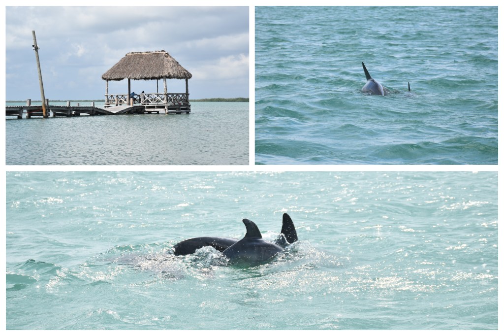 Doch zurück zur Bootstour: Nach einer kurzen Fahrt durch Mangroven, bei der ich die ganze Zeit damit rechnete mal wieder Krokodile zu sehen, waren wir plötzlich auf dem offenen Meer. Und was für ein Meer! Hier sahen wir endlich die Farben, die wir in Bacalar vergeblich suchten: von hellgrün über türkis bis dunkelblau war alles dabei. Als sich dann kurze Zeit später noch ein Delfinbaby samt Mutter zu uns gesellte, war das Glück perfekt. Eine ganze Weile schaukelten wir auf dem Wasser herum und bestaunten die Beiden. Obwohl wir mittlerweile schon viele Delfine in freier Natur gesehen hatten, so war es doch unser erstes Baby. Dieses hielt sich die gesamte Zeit über ganz dicht bei seiner Mutter und tauchte nur gemeinsam mit ihr (oder sie mit ihm?) auf. Obwohl die Kinder ihnen gut zuredeten, sprangen sie natürlich nicht hoch in die Luft, aber das war auch gar nicht nötig, da man sie in dem glasklaren Wasser hervorragend sehen konnte.