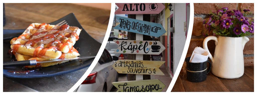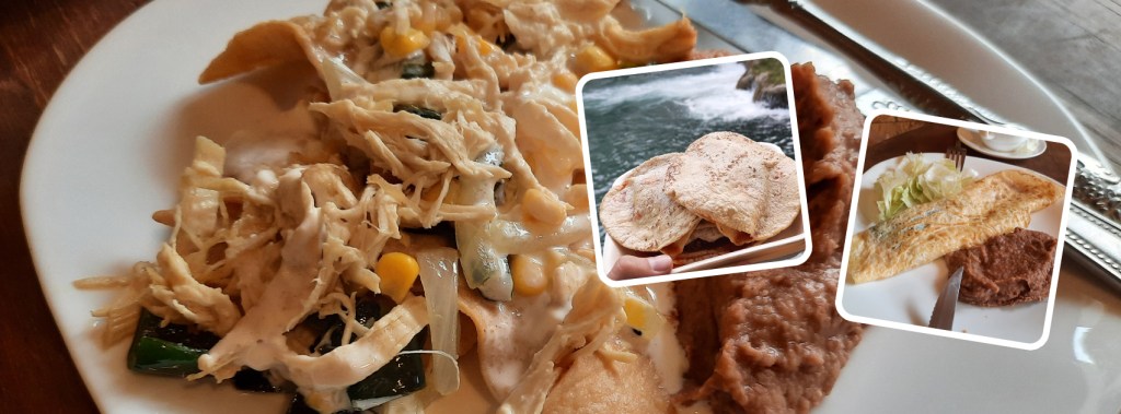 Zum Frühstück gingen wir in das Restaurant Barzam / Hoja santa, wo wir mal wieder eine ganz neue Variation des typischen Frühstücksgerichts Chilaquiles probierten. Dieses Mal wurden die Tortilla Chips mit Mais, Spinat, Zwiebeln und Huhn (und natürlich der obligatorischen Bohnenpaste) kredenzt. Interessante Kombination, aber sehr lecker! Die Gorditas genehmigten wir uns an den Cascadas (= Wasserfälle) de Tamasopo und sind ebenfalls empfehlenswert.