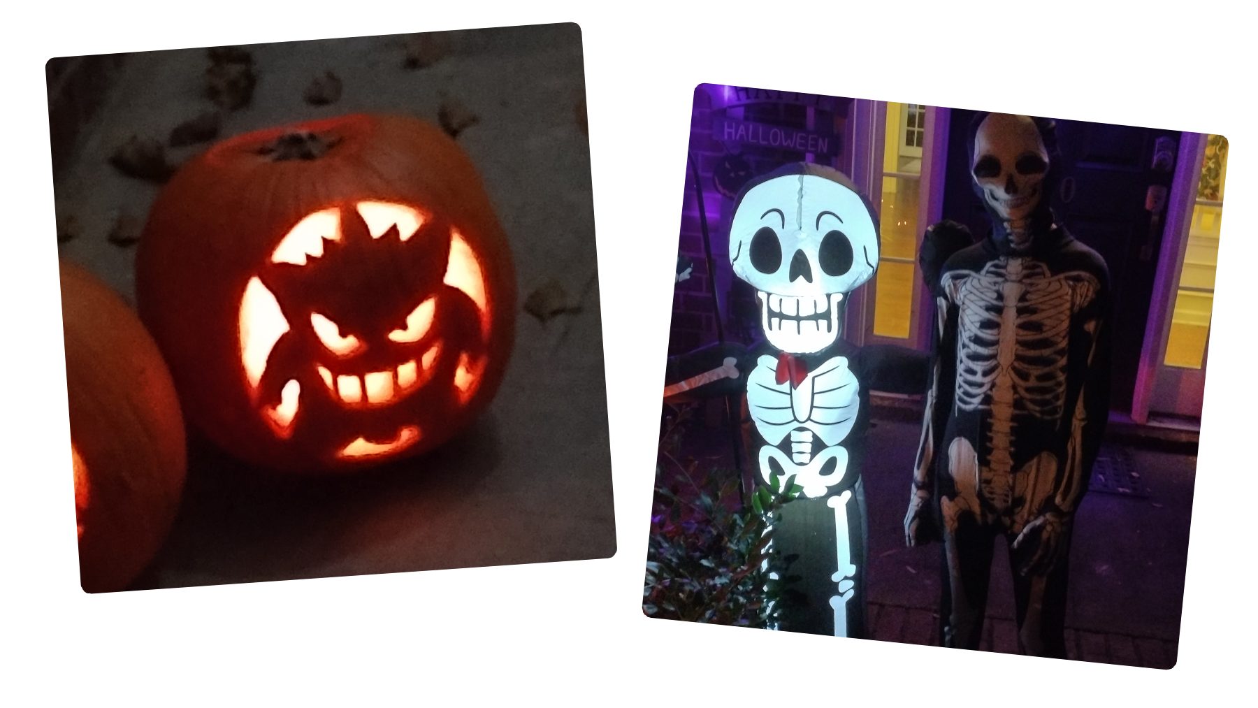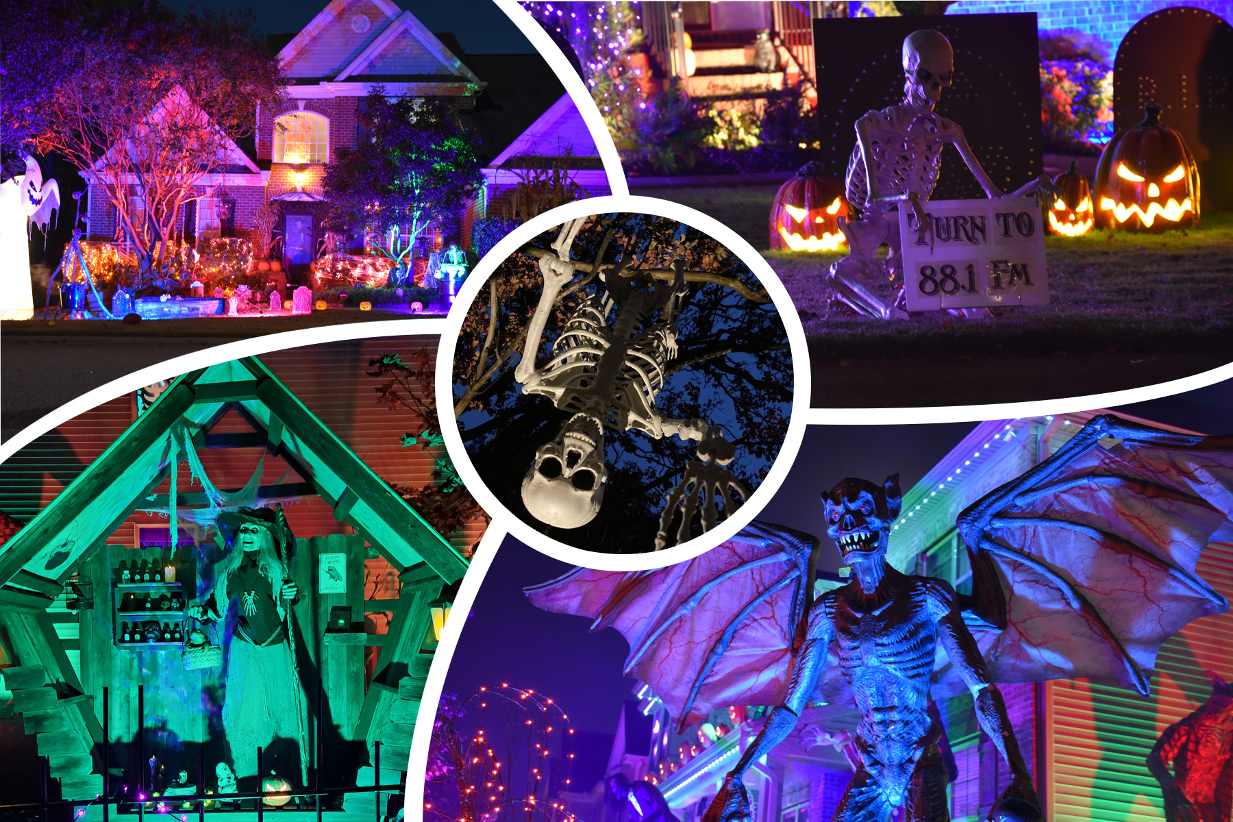 Besonders beliebt war dieses Jahr offenbar ein gut 6 m hohes Skelett, das gefühlsmäßig fast jeder hatte. Mein Favorit war das Haus, wo das Skelett mit einem Skelettdrachen Gassi ging und die gruselige Atmosphäre mit Nebelmaschine und schauriger Musik unterstrichen wurde. Überhaupt gab es dieses Jahr erstaunlich viele Nebelmaschinen, sprechende Zombies / Hexen / Skelette und Schilder mit Hinweisen auf bestimmte Radiosender. Wenn man letztere eingeschaltet hat, während man am Haus vorbeifuhr, wurde man entweder mit gruseliger Musik oder einer Geschichte beglückt.