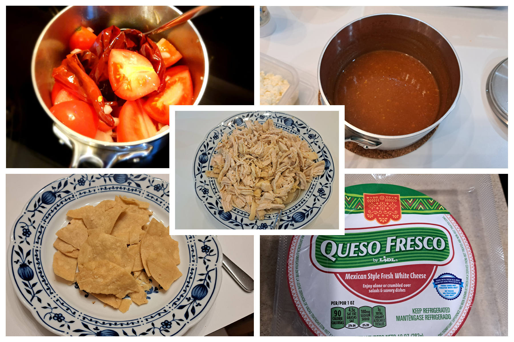 Soße und Hühnchen warm, den Rest kalt servieren. Beim Anrichten darauf achten, dass zuerst die Totopos mit reichlich Soße übergossen werden, damit diese etwas weicher werden. Falls Tostadas anstelle der Totopos genommen wurden, müssen diese noch in kleinere Stücke zerbrochen werden. Darüber das zerzupfte Hühnchen streuen – je feiner die Stücke, desto besser, dann Zwiebeln, Avocado und Käsestreusel und schlussendlich alles mit der Crema verzieren. Je nach Gusto kann noch feingehackter Koriander drübergestreut werden. Wer möchte, kann dazu noch Frijoles (= mexikanische Bohnenpaste) servieren wie oben im Titelbild zu sehen ist.