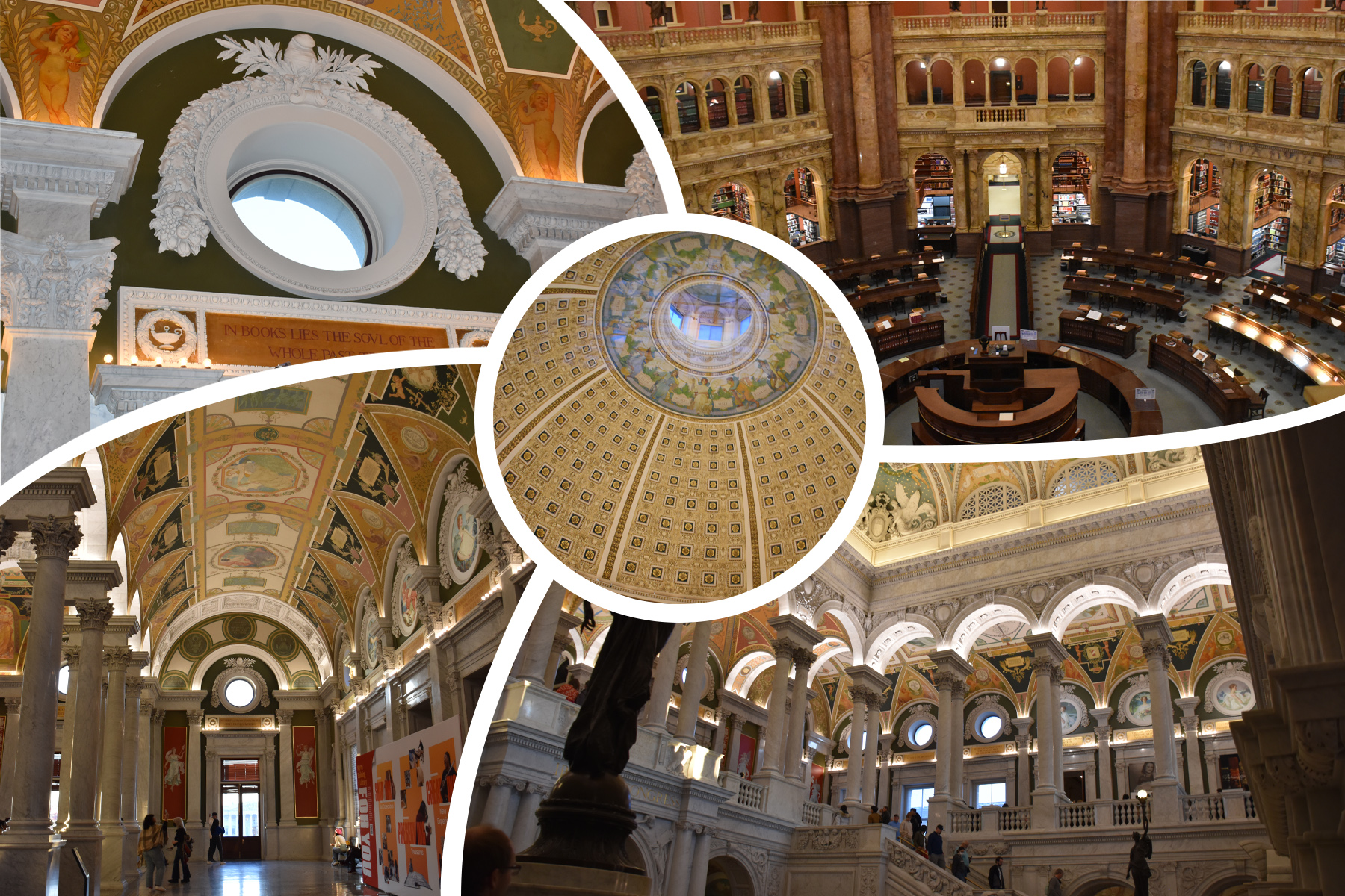 Äußerst beeindruckend ist auch die Library of Congress mit ihren über 800 Meilen (ca. 1300 km) Bücherregalen. Allein die schiere Anzahl lässt das Herz eines jeden Bücherwurms höher schlagen und die Einrichtung tut noch ihr Übriges: Im Vorraum bemalte Decken und Wände zwischen marmornen Säulen und prachtvollen Skulpturen und in der Bibliothek selbst hölzerne Pulte, verzierte Wände und eine kunstvoll bemalte Kuppel. Eine Führung gibt es hier nicht und man kann auch nur von oben in die Bibliothek hineinschauen, aber es lohnt sich trotzdem, diese 10-15 Minuten zu investieren.