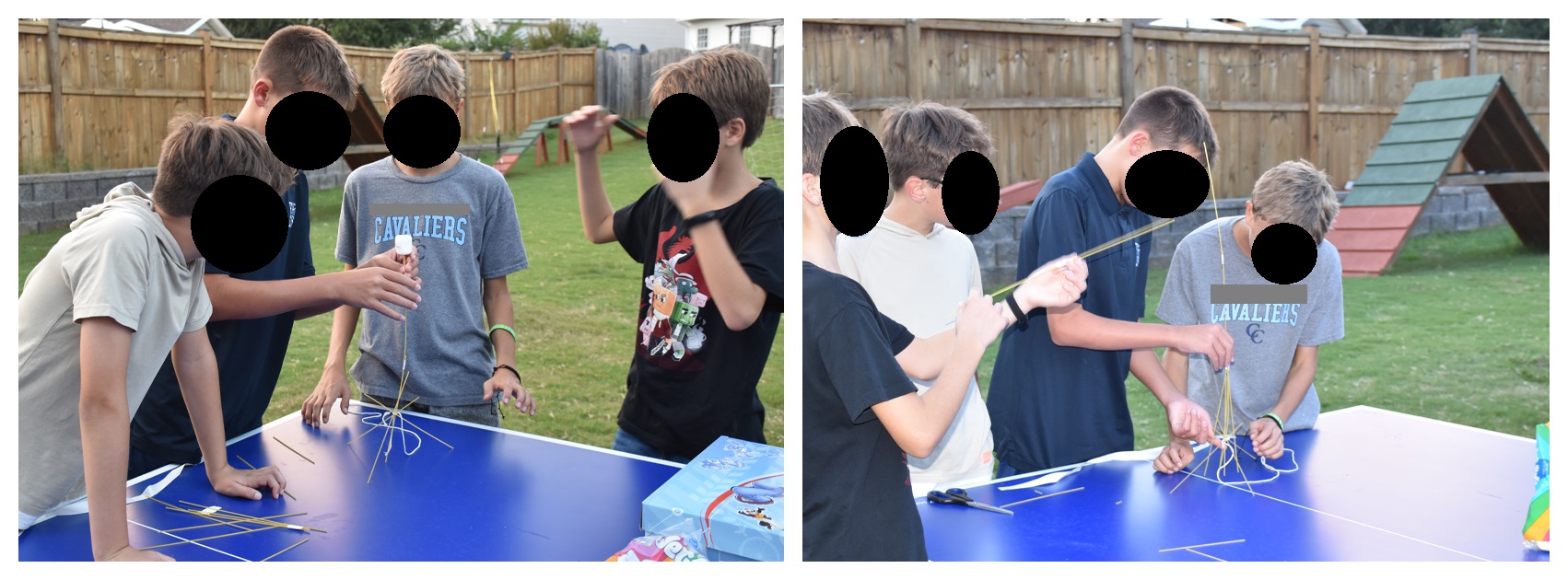 Bildet 2 (oder mehr) Teams. Pro Team sollten nicht mehr als 2-4 Kinder sein. Dieses Spiel ist vor allem für ältere Kinder geeignet, die Spaß am Konstruieren und Nachdenken haben. Ziel des Spiels ist es, nach 20 min die höchste Skulptur zu haben. Mit dem vorhandenen Material (siehe unten) muss das Gebilde so konstruiert werden, dass es ohne Festhalten auf dem Tisch stehen bleibt, während der Marshmallow auf der obersten Spagettispitze steckt. Die Skulptur muss für mind. 10 s so stehen bleiben ohne umzufallen und erst danach wird gemessen, wie hoch die Skulptur ist.