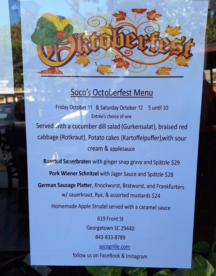 Wer im Oktober vor Ort ist, kommt sogar in den Genuss eines (mehr oder weniger) echten deutschen Oktoberfestmenus mit allerlei Köstlichkeiten wie Gurkensalat, Sauerbraten, diversen Würsten und Senf. Ob es schmeckt? Keine Ahnung, wir haben den Zettel nur im Schaufenster des Restaurants Soco Grille gesehen.